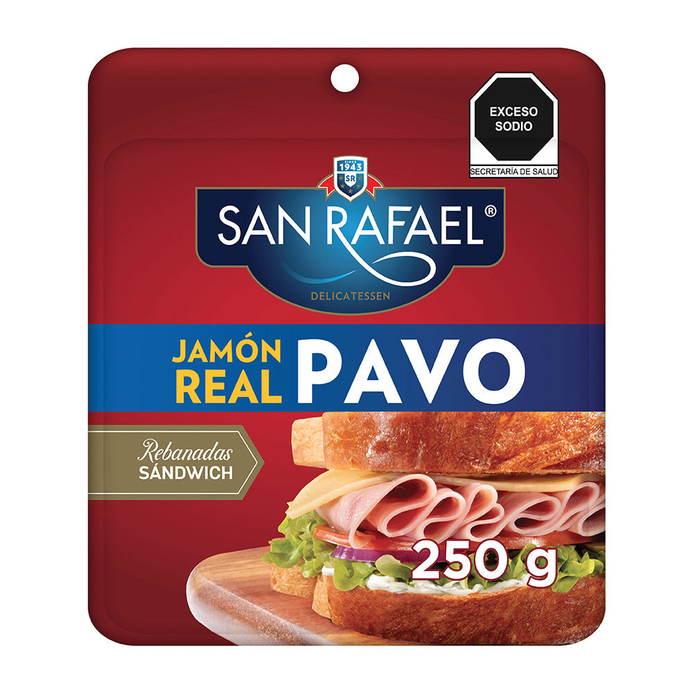 Jamón de pavo con la calidad de San Rafael con el tamaño justo del pan para realizar sándwich​ con un empaque rígido-rígido, ideal para la conservación y frescura del producto.